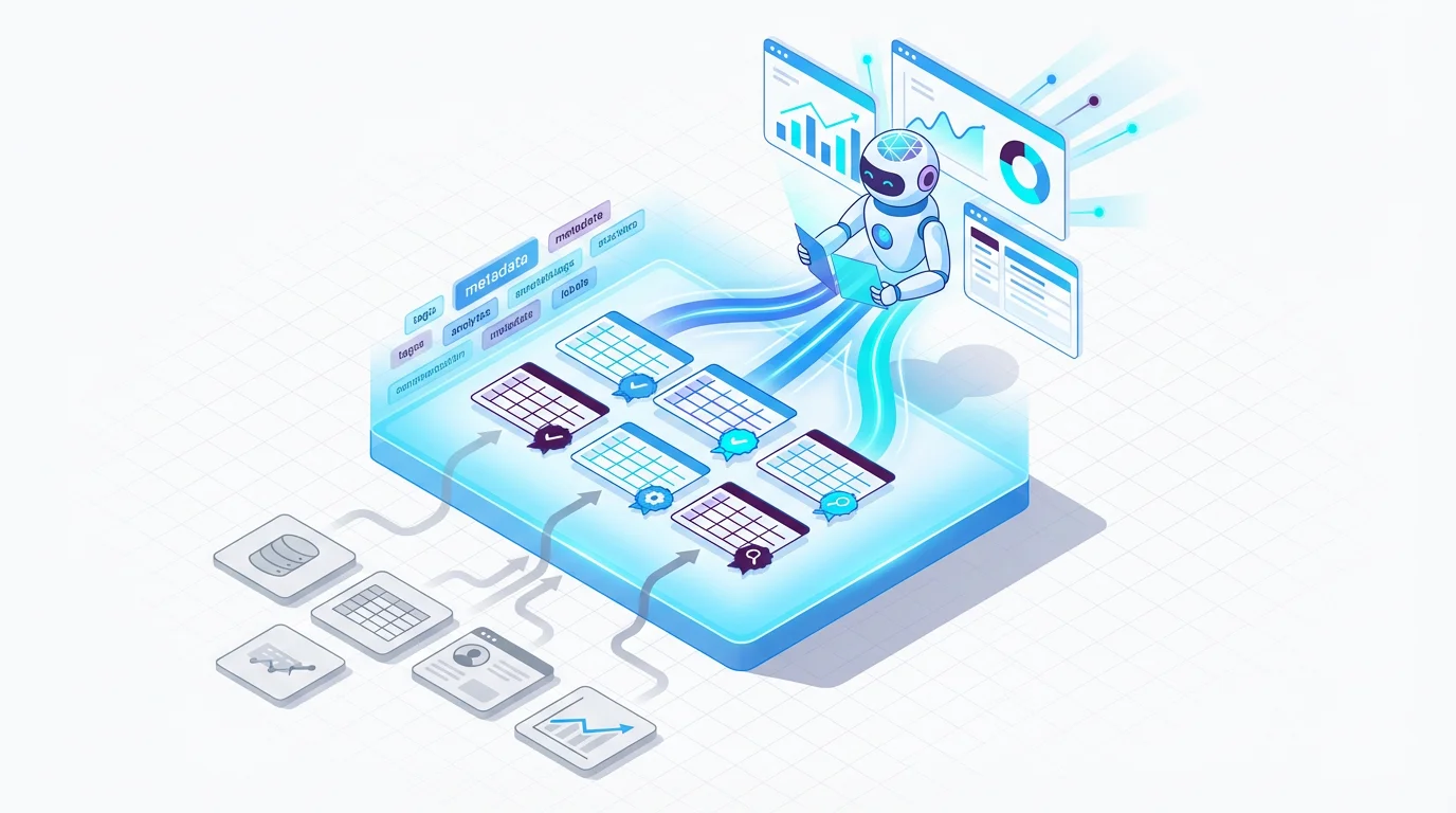 全データに業務文脈の説明書を付与し、業務用語の「正解」定義 + 模範的な分析クエリ集を一元化。AI は「お手本」を参照して答えるので、捏造(ハルシネーション)が起きにくい状態に。